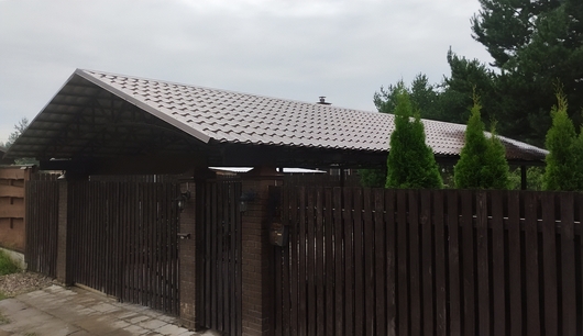 Двускатный навес из коричневой металлочерепицы для дома Арт-651